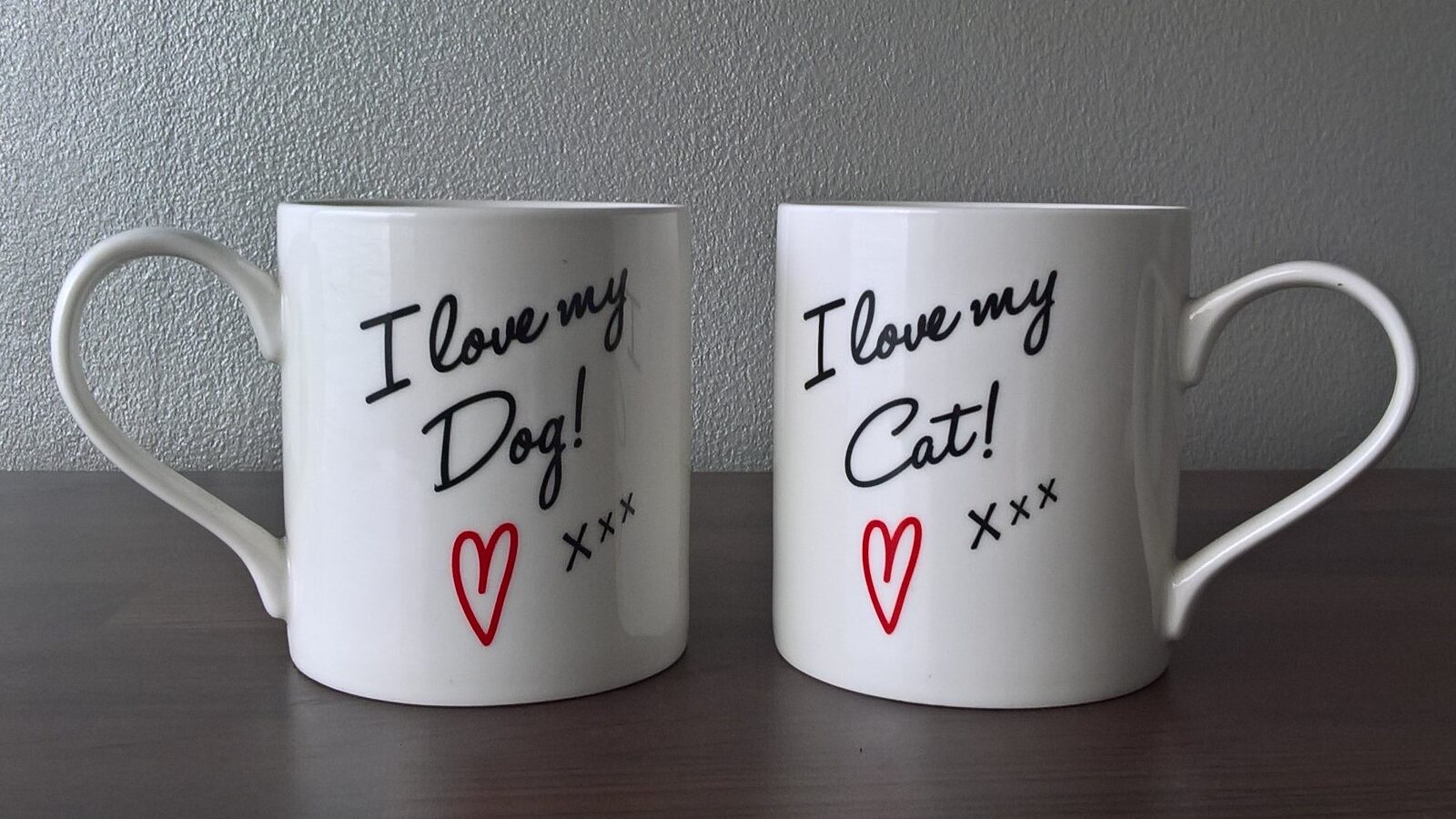 Högkvalitativ porslinsmugg med den stilrena texten ”I love my Cat!” (eller Dog!) och ett hjärta på båda sidor.